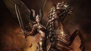 Valkyries are female warriors, and are servants of the god Odin. They are usually depicted with flaming red hair, although some artwork shows them with the more common fair hair of the north. They are almost always shown dressed in battle armour, often made of bronze or a similarly-coloured metal. This helps protect them from evil, and the likes of other enemies. Some are also shown with white or golden wings, as they must travel between this world and that of the gods, Valhalla. Other tales claim they ride horses with wings, sometimes identified as creatures in likeness to Pegasus.